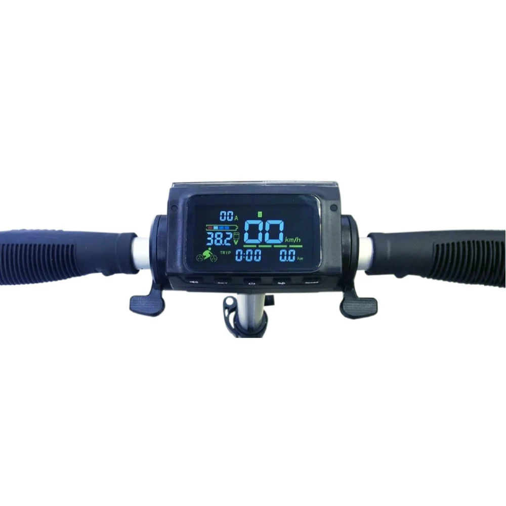 За счет удобной конструкции руля достигается полный контроль управления транспортным средством. На руле расположена специальная панель, через которую осуществляется управление электросамокатом во время движения. Здесь же располагается кнопка торможения, регулятор скорости, а также отображается время поездки, километраж и уровень заряда батареи.